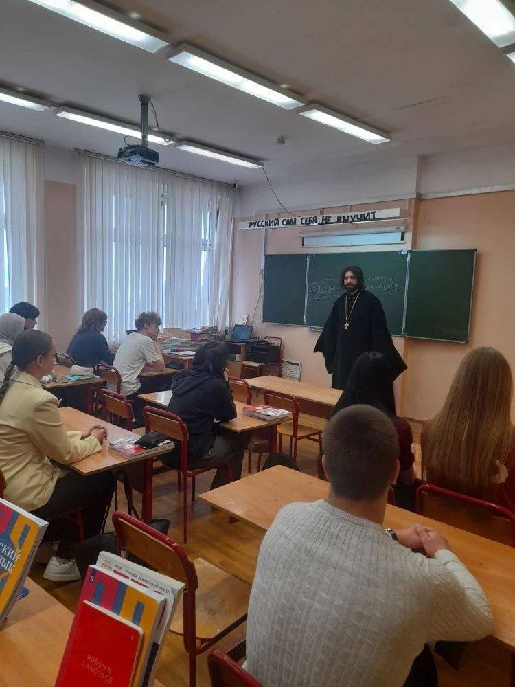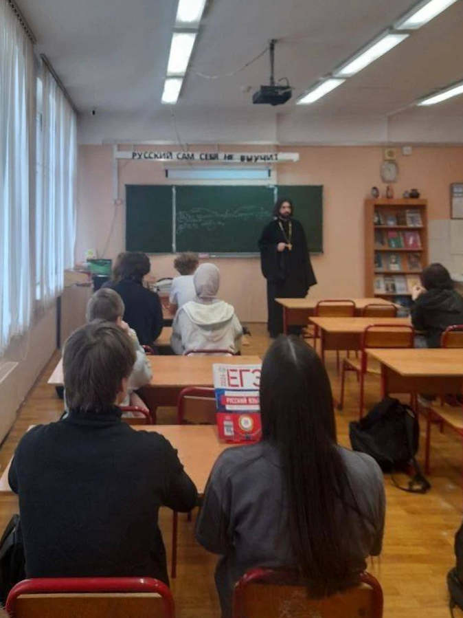 Клирик Троицкого храма д. Болтино иерей Владимир Мартон 12 февраля 2026 года провел встречу с учащимися 10-ого класса средней общеобразовательной школы №29 в Беляниново