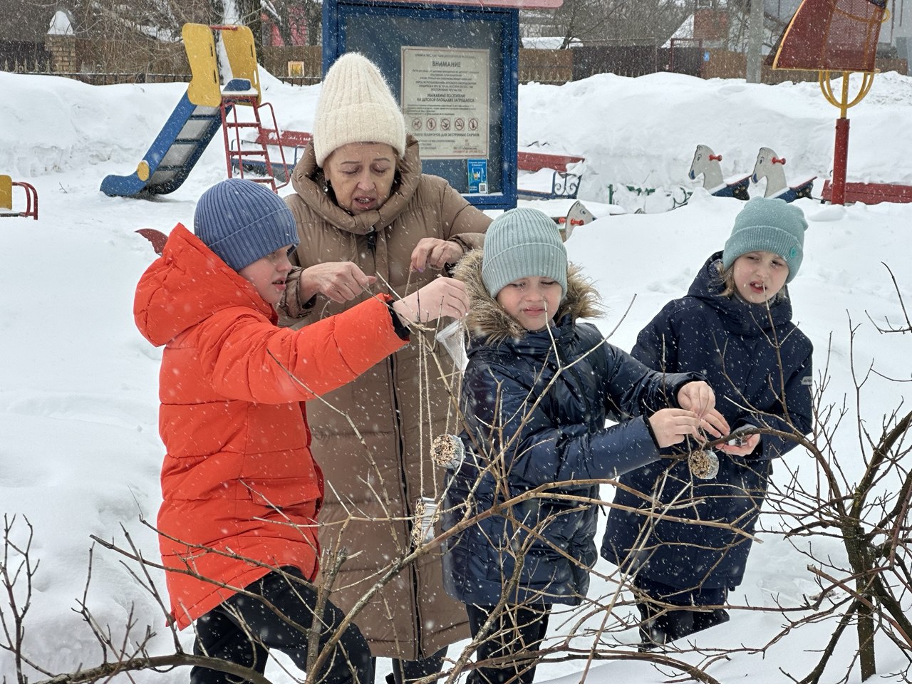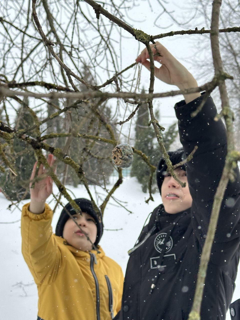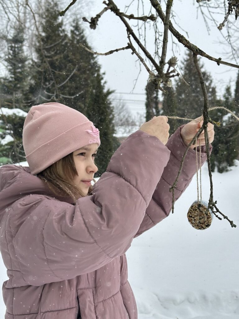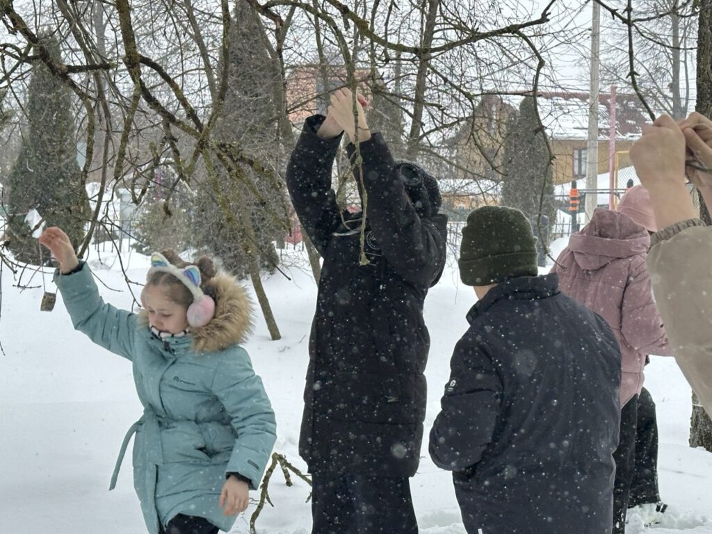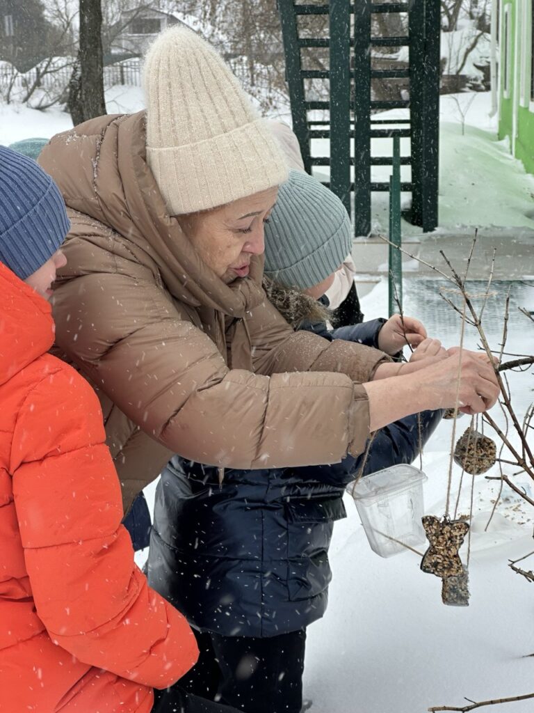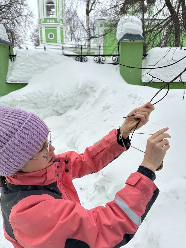 После занятия школьники вместе с учителями вышли на территорию школы и к храму Живоначальной Троицы, где разместили корм в установленных кормушках.