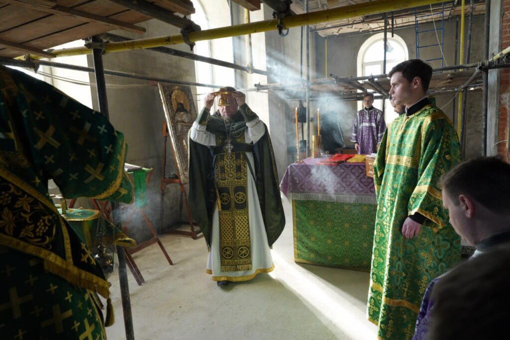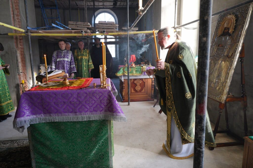 После богослужения благочинный в сопровождении настоятеля ознакомился с ходом реставрационных работ внутри Троицкого храма.