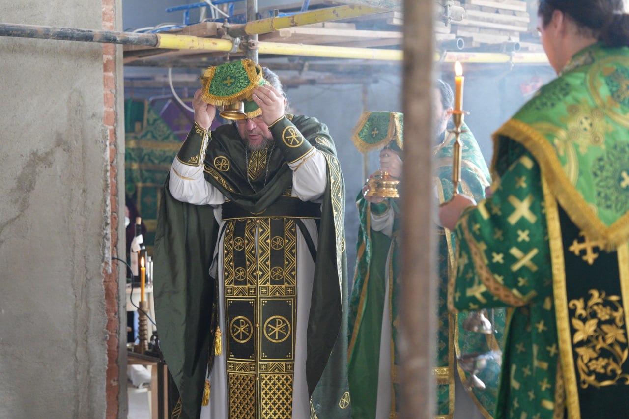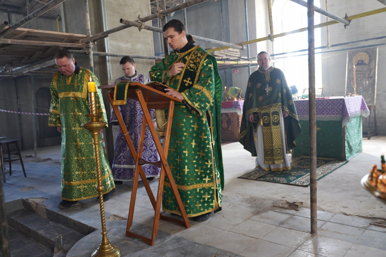 После богослужения благочинный в сопровождении настоятеля ознакомился с ходом реставрационных работ внутри Троицкого храма.